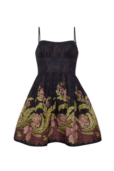 This mini fit-and-flare dress exudes feminine elegance with a modern structural twist. Crafted from a luxurious Silk Organza blend (52% Linen, 48% Silk) and lined with 100% stretch viscose, it features a ruched bodice with exposed boning at princess and side seams, creating a flattering, sculpted fit.