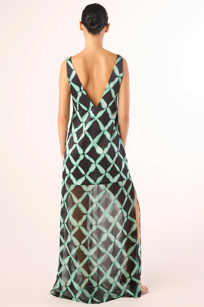 The Nina dress is a standout maxi silhouette for spring. Sleeveless with a deep V-neckline and V-back, it features celadon green lines intersecting against deep black to create a modern lattice effect. The shift-style bodice is cut from satin to a mini length before flowing into a sheer chiffon skirt with double side slits in the same print. A striking, modern style designed to carry you through every event this season and beyond.
