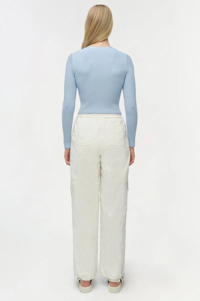 The Ailany Knit Cardigan in Tidepool Crafted in compact rib knit, this fitted shrunken cardigan features a streamlined silhouette with button-front detailing. Its cropped length makes it an ideal partner to high-waisted trousers, creating a harmonious balance between cozy and chic.